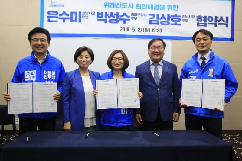 지난 27일 은수미 더불어민주당 성남시장 후보가 박성수 송파구청장 후보, 김상호 하남시장 후보와 함께 수정구에 위치한 밀리토피아 호텔 회의실에서 ‘위례신도시 현안해결을 위한 성남시·송파구·하남시 더불어민주당 자치단체장 후보 공동협약’을 체결했다.