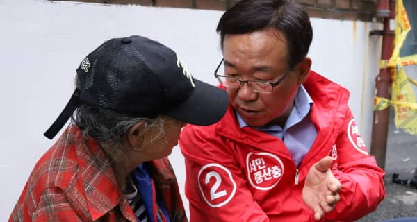 성남시장 선거에 출마한 자유한국당 박정오 후보는 17일 오전 수정구 재개발 지역을 직접 답사하는 과정에서, 폭우로 1층 가정집 담벼락이 무너져 내린 사고현장을 발견하고 현장에서 직접 피해자를 만나 위로를 전했다.