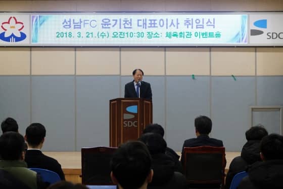 지난 3월 20일 주주총회와 이사회를 통해 윤기천 전 분당구청장을 제 4대 대표이사로 선임한 성남FC가 21일 신임 대표이사 취임식을 가졌다. 지난 21일 오전 10시 30분 탄천종합운동장 이벤트홀에서 열린 취임식에는 성남FC 남기일 감독을 비롯한 선수단 전원과 구단 프런트, 유소년 지도자, 성남시 관계자 등 100명이 참석하여 자리를 빛냈다.