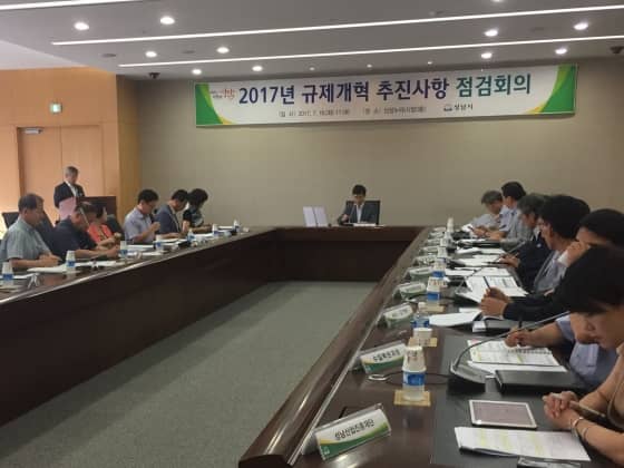 성남시(시장 이재명)는 올해 56개 내용의 규제개혁을 추진 중인 가운데 이를 점검하는 회의를 7월 18일 시청 산성누리에서 진행했다. 김진흥 성남시 부시장이 주재한 이날 회의는 기업·시민 불편을 초래하는 불합리한 규제개선에 관한 실무부서의 유기적인 협력을 끌어내기 위해 마련됐다.