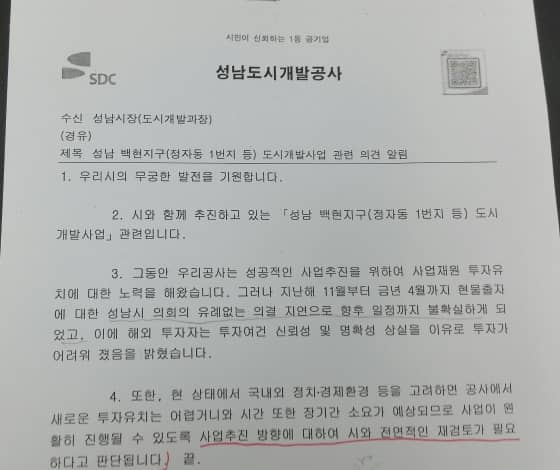 지난 4월 14일 성남도시개발공사 황호양사장이 성남시 도시개발과장에게 보낸 공문에 따르면 ‘지난해 11월부터 지난 4월까지 현물출자에 대한 성남시 의회의 유례없는 의결 지연으로 향후 일정까지 불확실하게 돼 해외 투자자는 투자여건 신뢰성 및 명확성 상실을 이유로 투자가 어려워 졌음을 밝혔다'며 "공사에서 새로운 투자유치는 어렵거니와 (중략) 사업추진 방향에 대해 시와 전면적인 재검토가 필요하다'고 적시돼 있다.