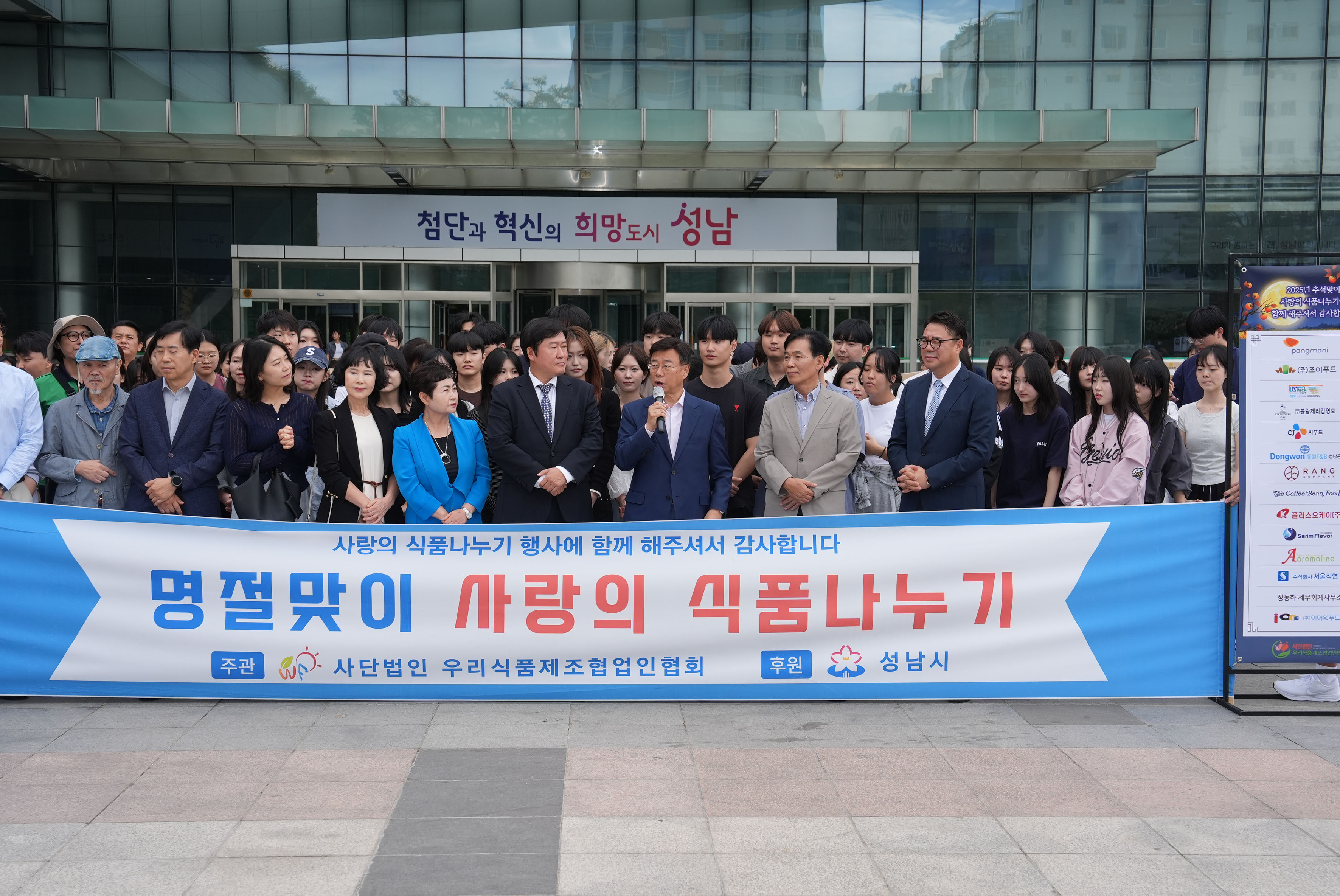 성남지역 식품 관련 업체들이 추석 명절을 앞두고 1억2800만원 상당의 먹거리를 41곳 사회복지시설에 보내 온기를 전했다. ㈔우리식품제조협업인협회는 9월 23일 오전 11시 성남시청 광장에서 ‘추석 명절맞이 사랑의 식품 나누기 행사’를 열었다.