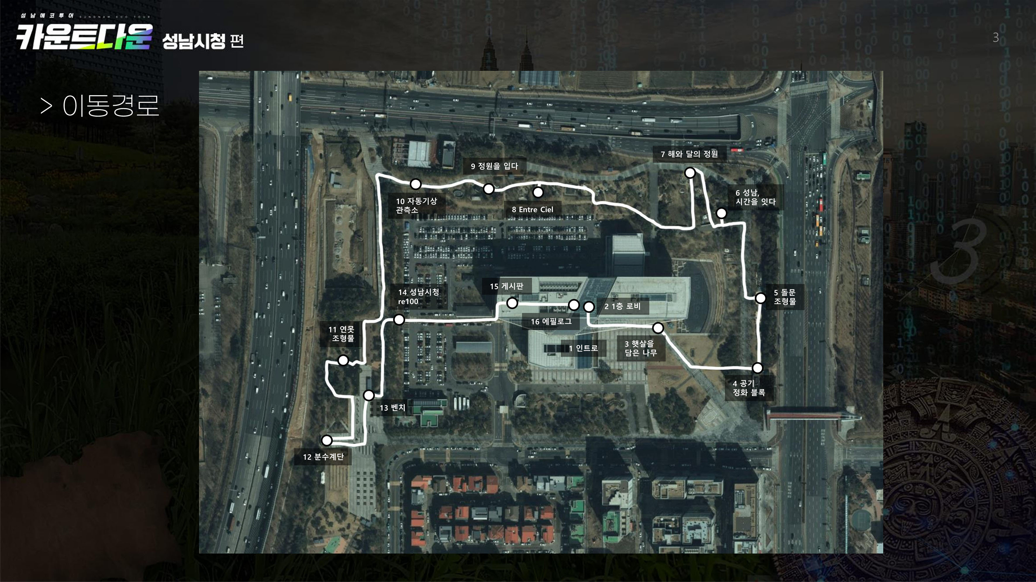 환경파괴를 막기 위해 미래에서 온 비밀 요원(성나미)과 함께 지구를 지킬 단서를 찾는 이야기(스토리텔링)와 증상현실 게임이 결합해 17단계의 미션을 수행하는 방식의 환경 체험이 이뤄진다. 게임 내용은 시청 너른못 광장에는 있는 ‘햇살 담은 나무 조형물’, 시청 공원 내 공기정화 블록, 돌문 조형물, 정원 유리판 등에 숨겨진 미션 단어로 환경 관련 정답 찾아내기, 성남자원순환가게 시청점에서 분리배출 등의 단서로 빈칸에 핵심 단어 입력하기 등이다.