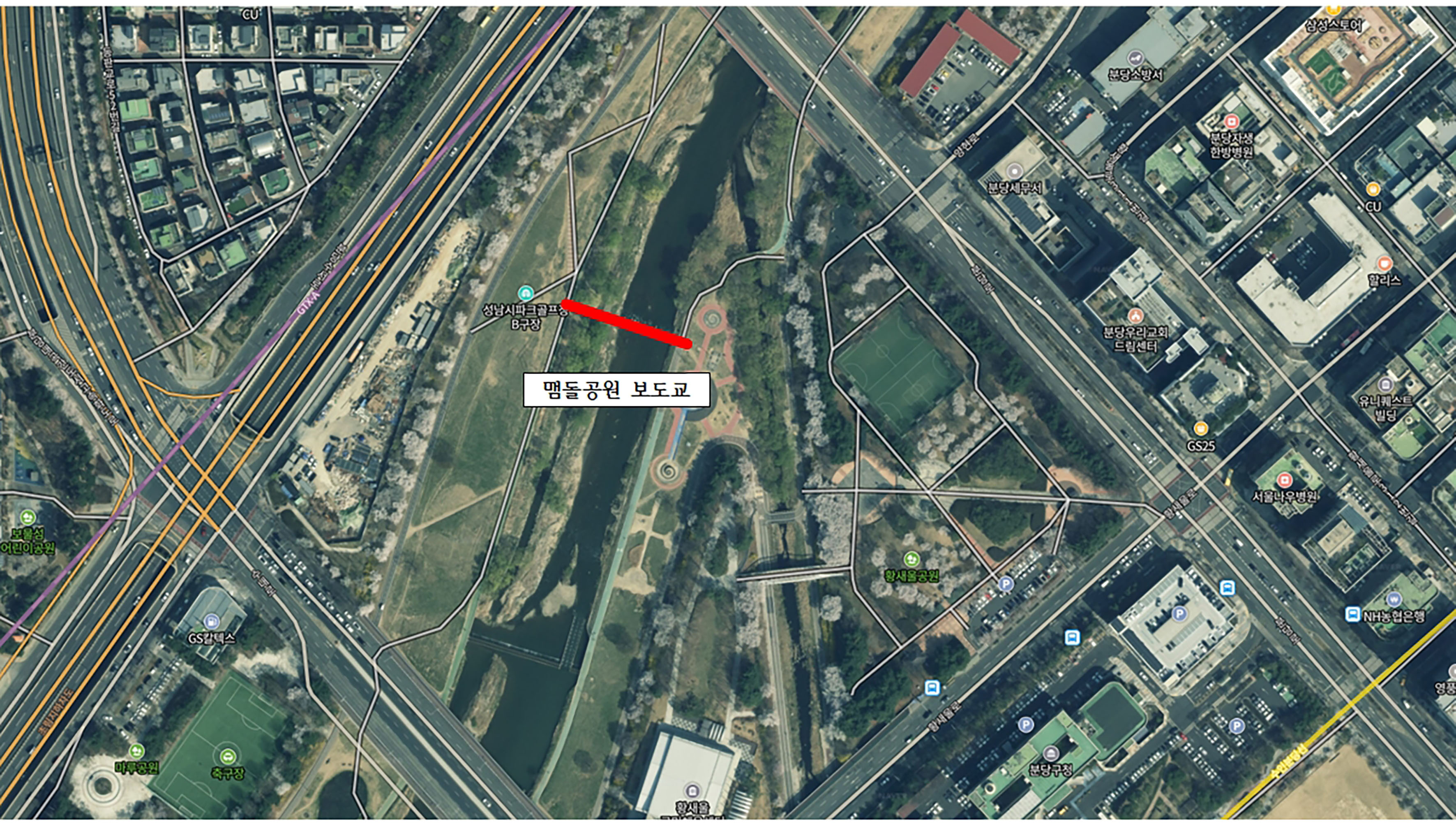성남시 탄천 맴돌공원 보도교 설치…백현동~수내동 동서로 연결밑에 있던 징검다리는 구미동 무지개마을 인근 탄천으로 이전  성남시는 분당구 수내동 44번지 일원 탄천에 맴돌공원 보도교 설치를 완료해 개통했다고 16일 밝혔다. 이번 보도교는 백현동 3단지 앞 성남시 파크골프장 B구장 지점과 수내동 맴돌공원 물놀이장(분당구청 쪽) 지점을 동서로 연결한다.…