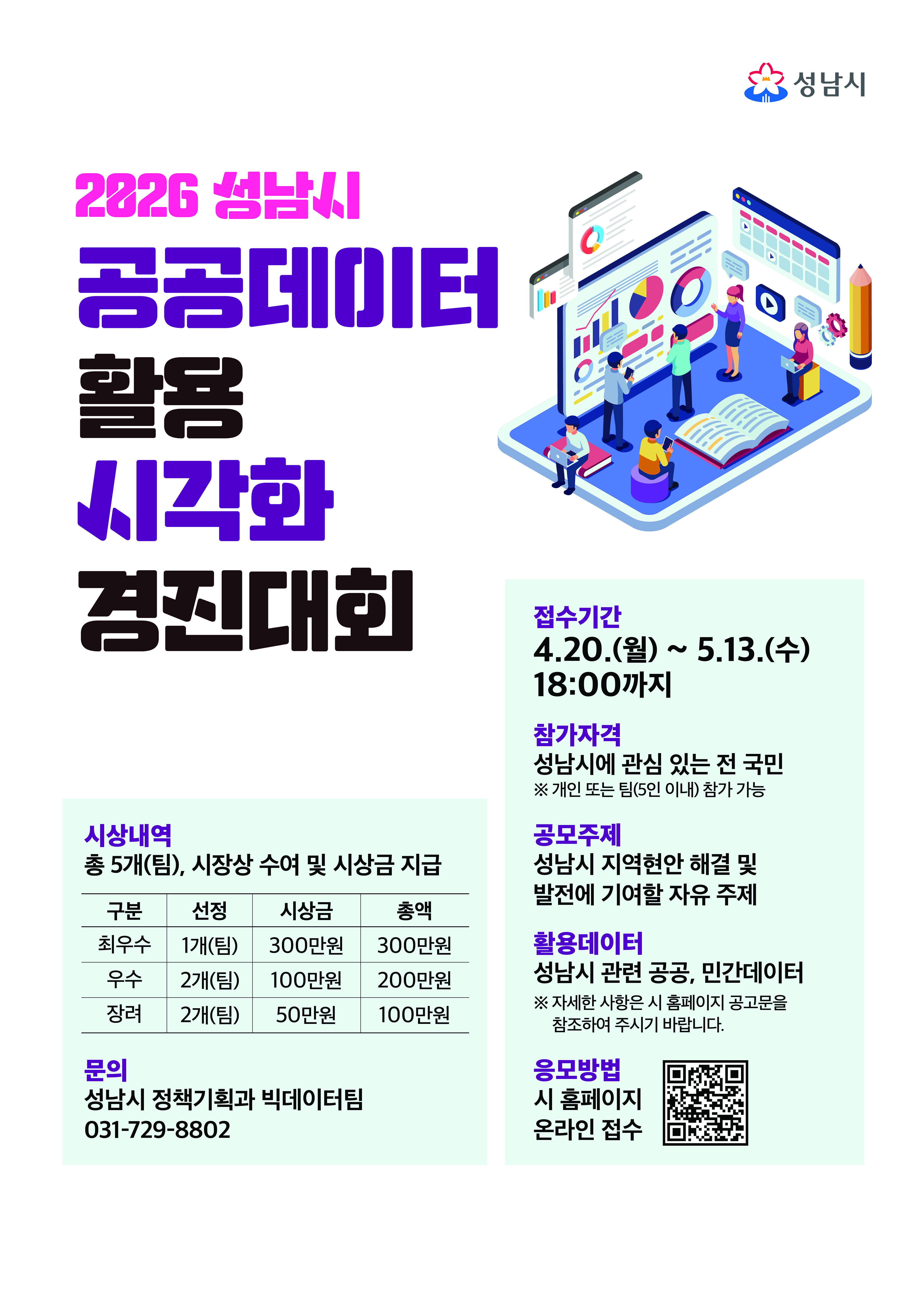 성남시 ‘공공데이터 활용 시각화 경진대회’ 참여 작품 공모전 국민 대상…데이터로 그리는 성남의 현재와 미래  성남시(시장 신상진)는 오는 4월 20일부터 5월 13일까지 전 국민을 대상으로 ‘공공데이터 활용 시각화 경진대회’ 참여 작품을 공모한다. 이번 공모는 공공·민간 데이터로 성남의 현재와 미래를 그려내고, 데이터 시각화를 통해 실효성 있는 정…