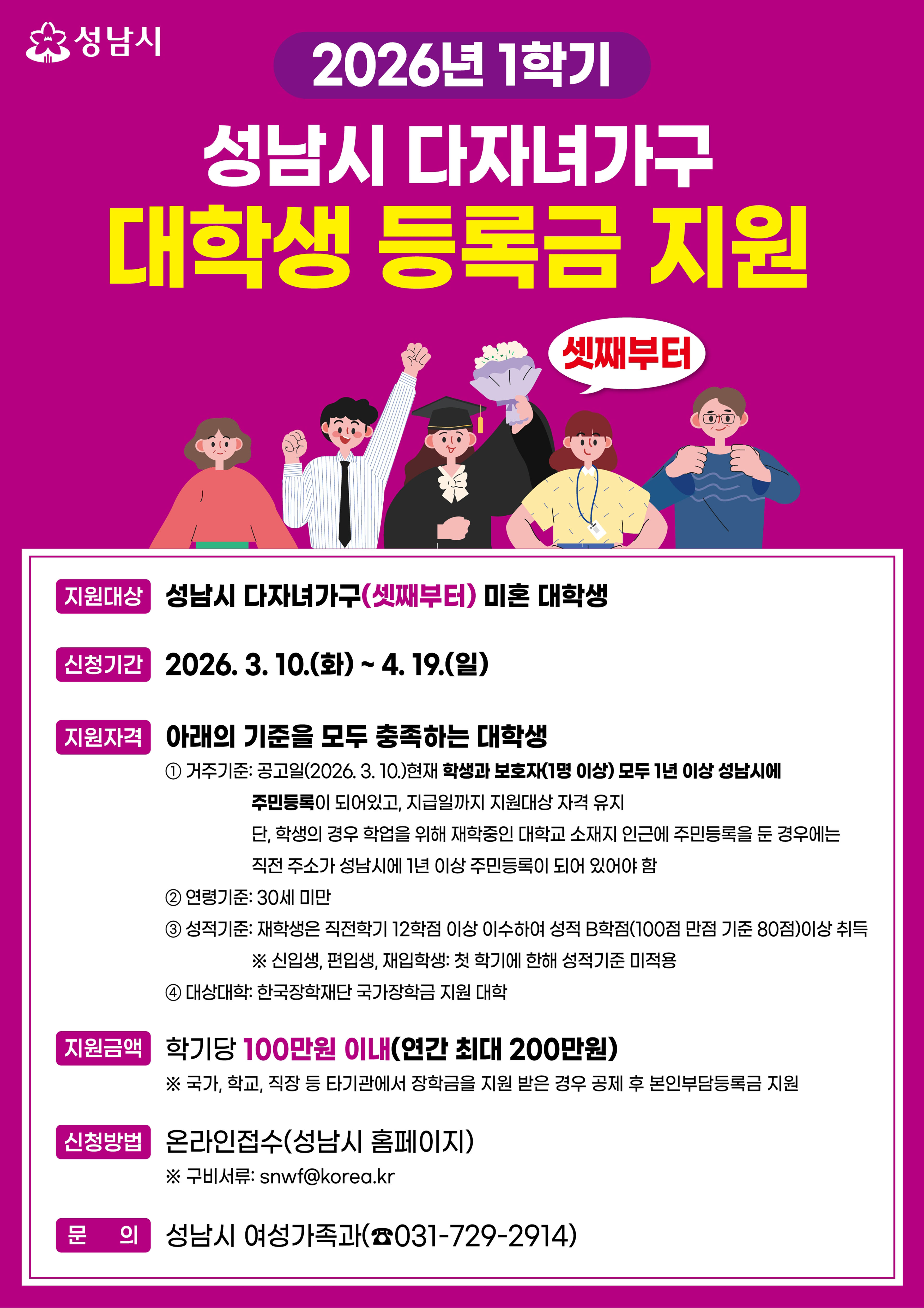 성남시, 셋째 이상 대학생에 ‘학기당 최대 100만원’ 등록금 지원“다자녀가구 경제적 부담 던다” 4월 19일까지 1학기분 신청받아  성남시(시장 신상진)는 다자녀가구의 경제적 부담을 덜기 위해 셋째 이상 대학생에게 학기당 최대 100만원(연 200만원)의 등록금을 지원한다고 12일 밝혔다. 이를 위해 올해 7억8000만원의 사업비를 확보하고, 오…