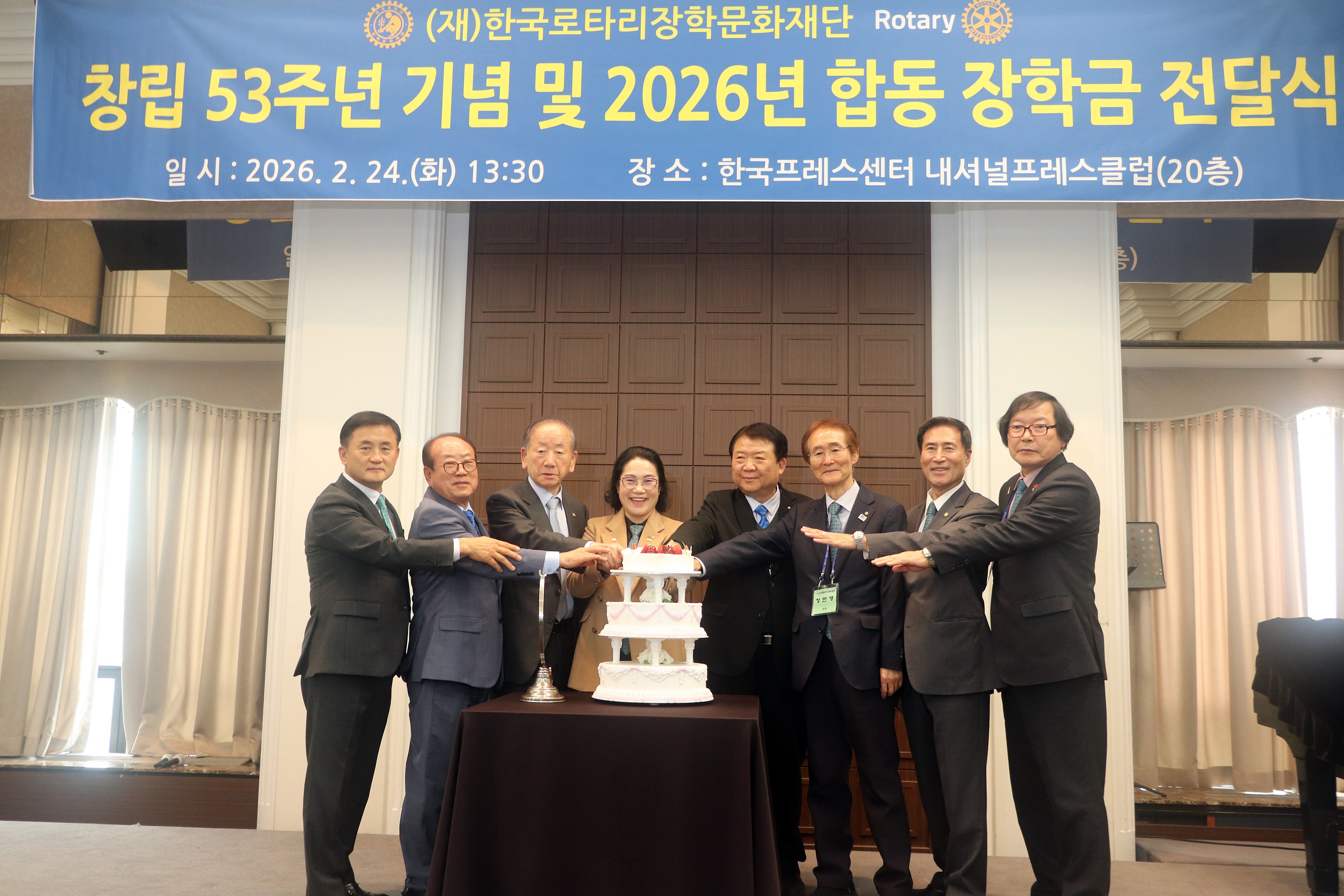 한국로타리 장학문화재단, ‘창립 53주년 기념 및 2026년도 합동 장학금 전달식’ 개최2,470여 명에 금년도 장학금 52억3,000만 원 전달(재)한국로타리 장학문화재단(이사장 신해진, 이하 재단)은 2월 24일 한국프레스센터에서 한국로타리 지도자와 지구 현·차기 총재, 고액기부자, 관명장학의인을 비롯한 클럽회장 및 재단 임원이 참석한 가운데 ‘창립 53주년 기념 및 2…
