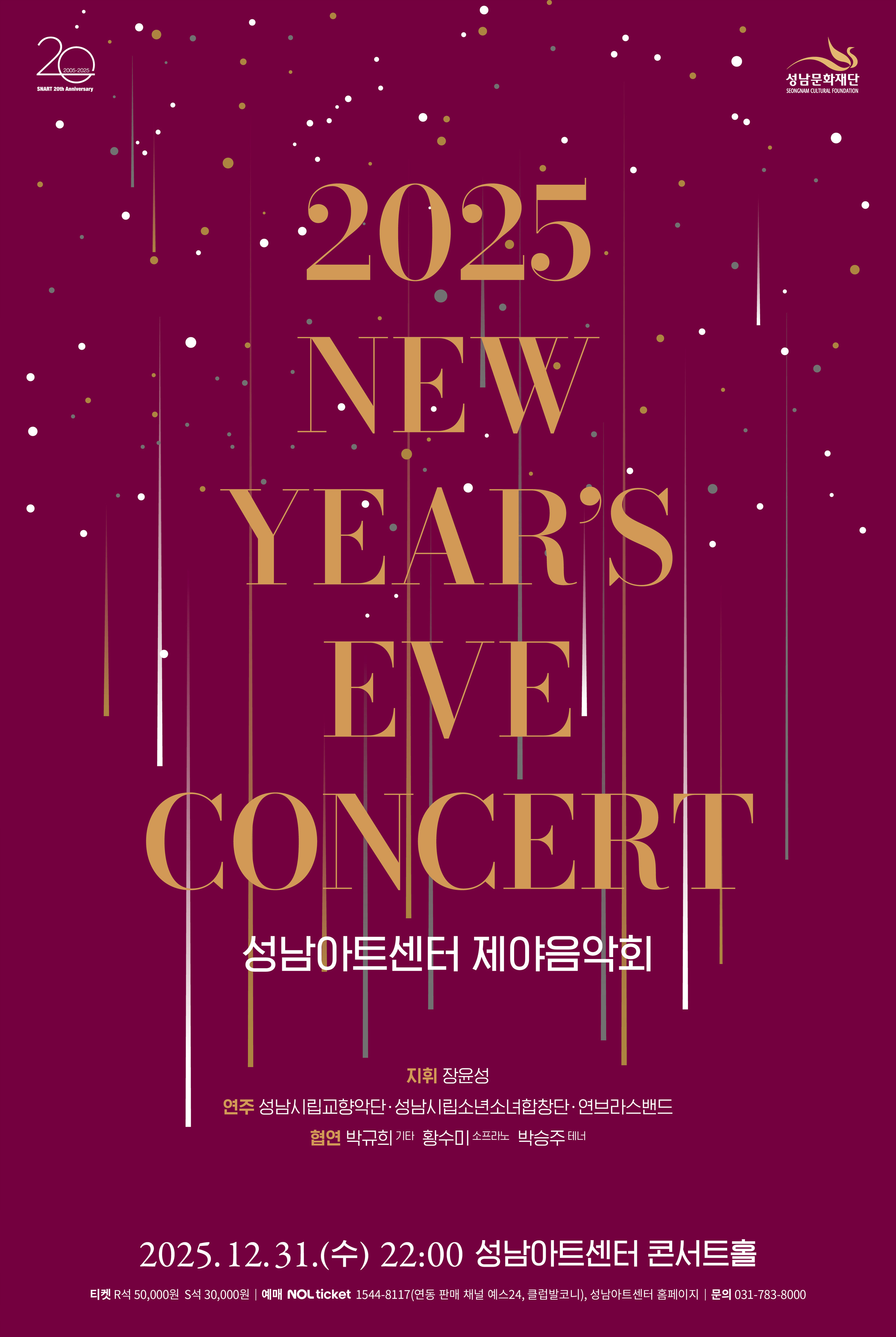 성남아트센터,‘2025 제야음악회’개최12월 31일(수) 밤 10시, 성남아트센터 콘서트홀성남문화재단(대표이사 윤정국)은 한 해의 끝과 새로운 해의 시작을 음악으로 잇는 ‘2025 성남아트센터 제야음악회’를 오는 12월 31일(수) 밤 10시 성남아트센터 콘서트홀에서 개최한다. 성남아트센터 제야음악회는 매년 품격 있는 연주와 볼거리 넘치는 무대, 국내외 정상급 협연…