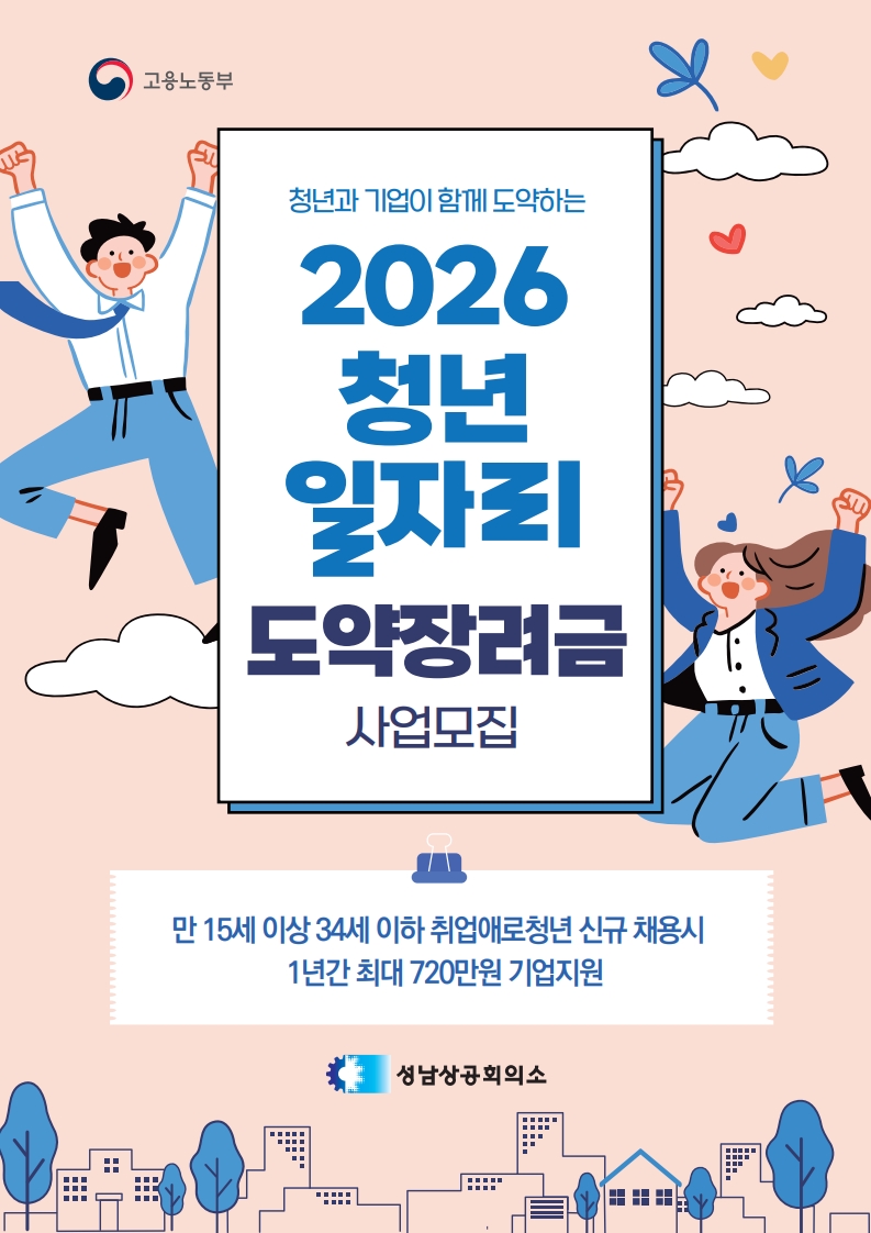 성남상공회의소, 2026년 청년일자리도약장려금 사업 운영성남상공회의소(회장 정영배)는 청년 일자리 창출 지원을 위해 고용노동부의 「청년일자리도약장려금」 사업을 운영한다고 밝혔다. 청년일자리도약장려금 사업은 사업주와 청년 근로자를 동시에 지원하는 제도로, 청년의 신규 채용을 촉진하고 고용 안정을 도모하기 위해 추진된다. 정규직 채용 시 채용일로부터 3개월 이내 신청할…