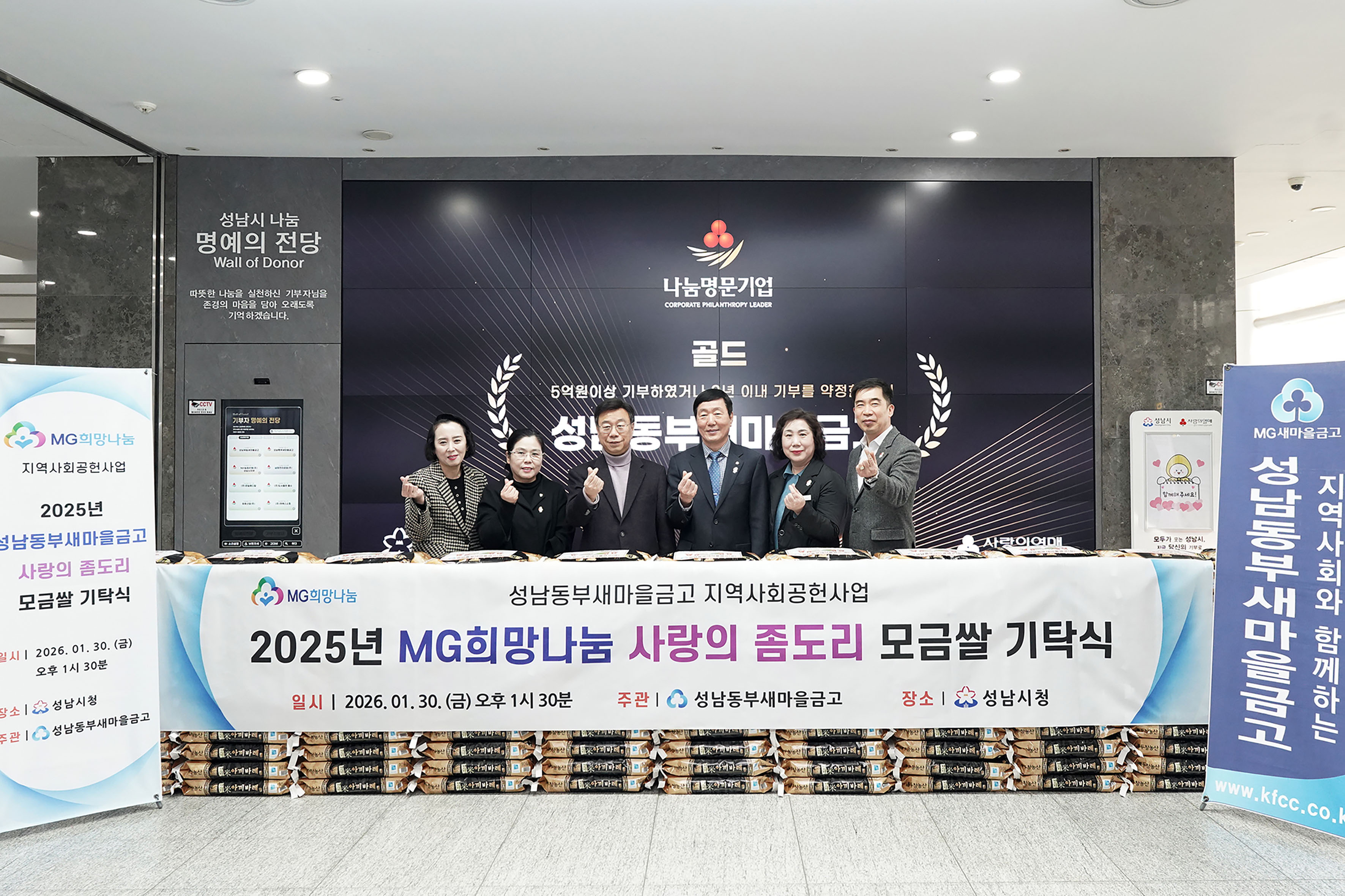 성남동부새마을금고, 쌀 4560만원 상당 성남시에 기탁저소득 취약계층 돕기 위한 ‘좀도리 운동’으로 마련성남동부새마을금고는 저소득 취약계층에 전달해 달라며 1월 30일 성남시에 4560만원 상당의 쌀 1472포대(10㎏들이)를 맡겼다. 시는 이날 오후 1시 30분 시장 집무실에서 신상진 성남시장과 황규덕 성남동부새마을금고 이사장 등이 참석한 가운데 ‘희망 나눔, 사…