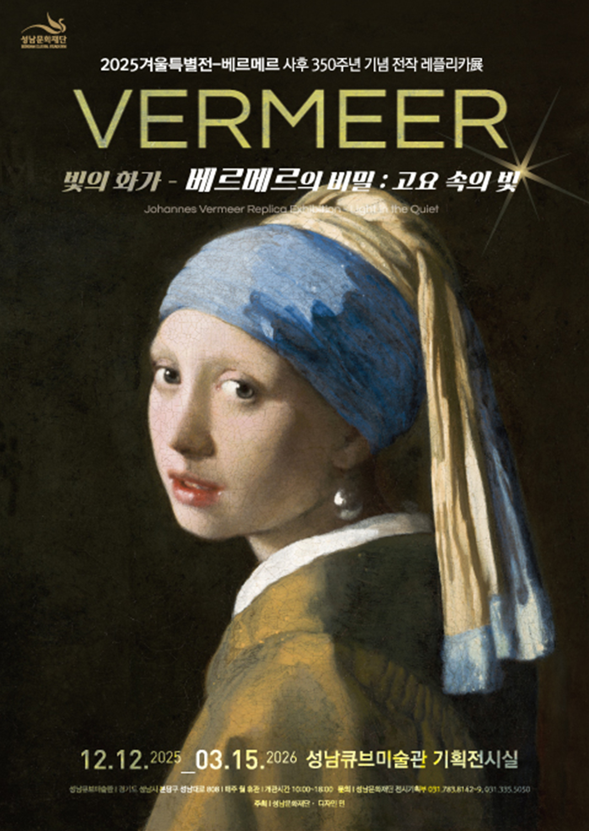 고요 속에 스며든 빛, 베르메르의 전작을 만나다.성남문화재단, 겨울 특별기획전 ‘베르메르의 비밀: 고요 속의 빛’레플리카 전시 성남문화재단(대표이사 윤정국)은 네덜란드를 대표하는 거장 요하네스 베르메르의 예술세계를 조망하는 겨울 특별기획전 ‘베르메르의 비밀: 고요 속의 빛’ 레플리카 전시를 12일(금)부터 내년 3월 15일(일)까지 성남큐브미술관 기획전시실에서 개최…