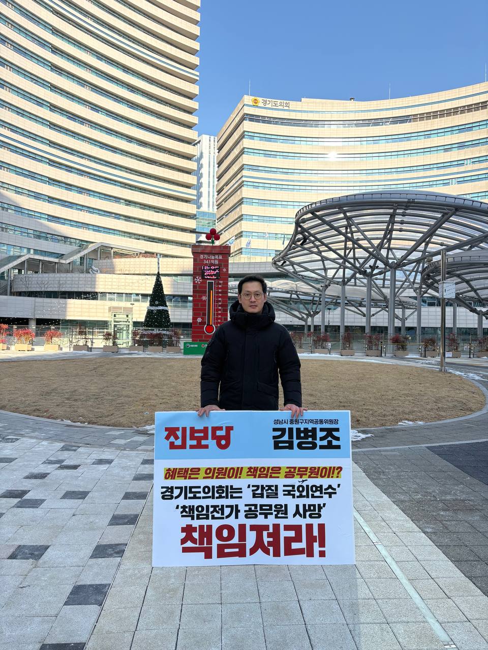 (성명서) 김병조 중원구 공동위원장, 성역 없는 수사 촉구지방의회 ‘갑질 연수’와 ‘책임 전가’, 이제는 끝내야 합니다최근 경기도의회 공무원의 안타까운 죽음은 단순한 개인적 선택이 아닙니다. 의원들의 무분별한 해외연수의 뒤편에는 편법 관행의 반복과 이에 따른 경찰 조사라는 중압감을 오롯이 직원들이 감당해야 했던 구조적 타살이고, 지방의회 특권 남용과 구조적 책임 전가가 초래…