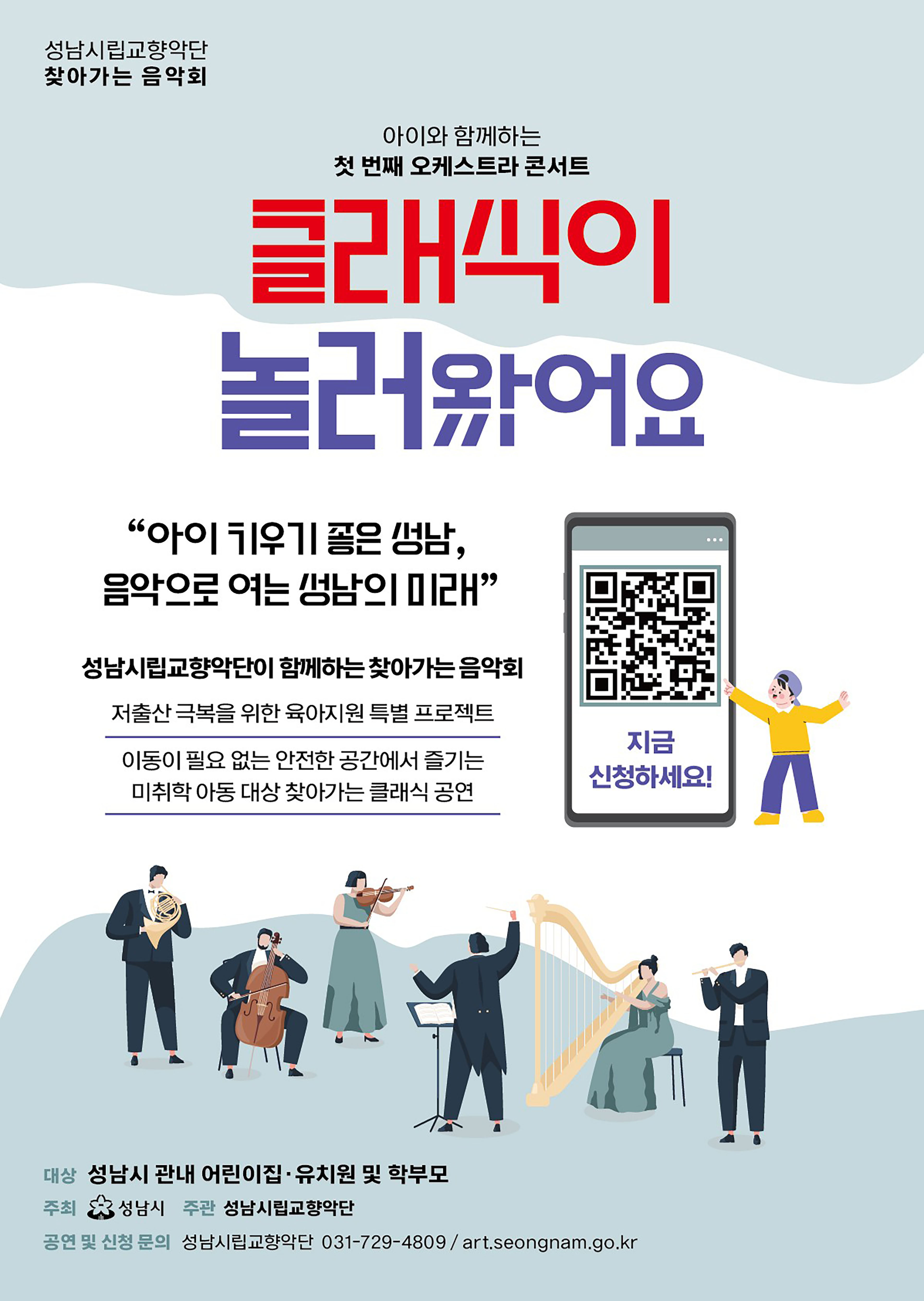 성남시향, 어린이집·유치원 150곳 찾아가 음악회 “클래식이 놀러 왔어요” 영유아 눈높이 맞춘 연주·해설  성남시는 시립교향악단이 연말까지 어린이집과 유치원 150곳을 찾아가 ‘클래식이 놀러 왔어요’를 주제로 한 음악회를 진행한다고 23일 밝혔다. 클래식 공연 관람에 제약이 있는 영유아에게 악기 소리와 음악의 즐거움을 자연스럽게 경험하는 …