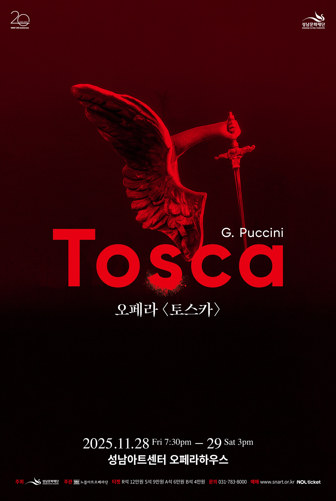 성남문화재단(대표이사 윤정국)은 성남아트센터 개관 20주년을 기념해, 푸치니의 걸작 오페라 ‘토스카’를 오는 11월 28일(금)과 29일(토) 양일간 성남아트센터 오페라하우스에서 공연한다.